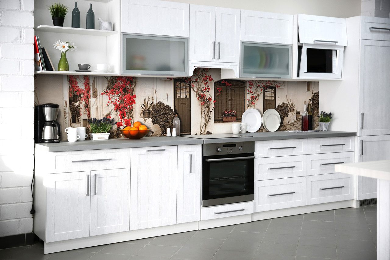 ПодарунокКухонний фартух Червоні Квіти на білих стінах (вінілова наклейка скіналі ПВХ) Архітектура Бежевий 600*2000 мм