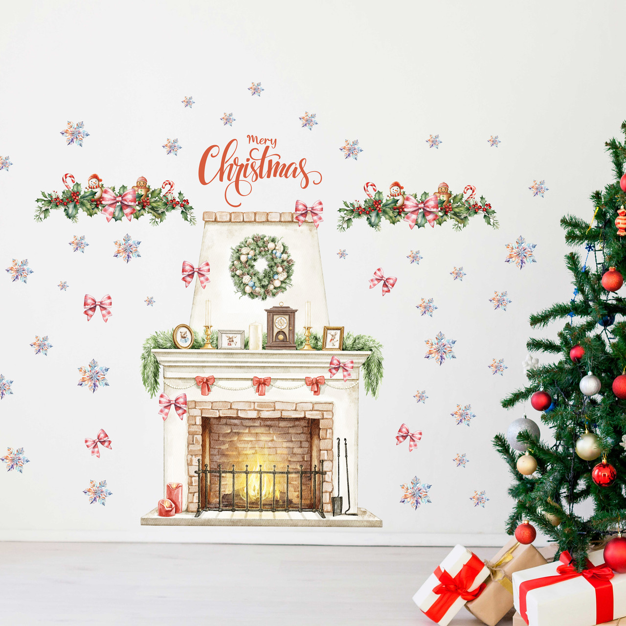 ПодарунокВінілові новорічні наклейки Різдвяний камін прикраси сніжинки Набір 1100х1000мм матова